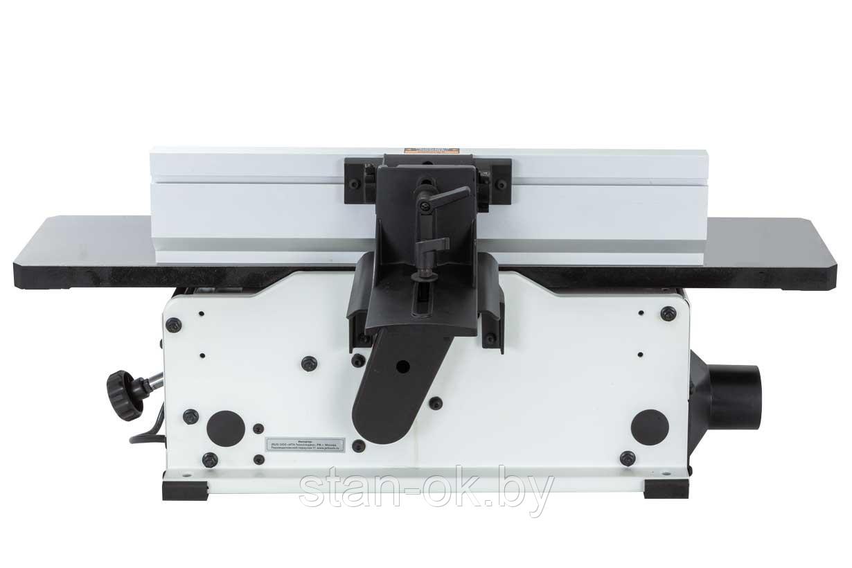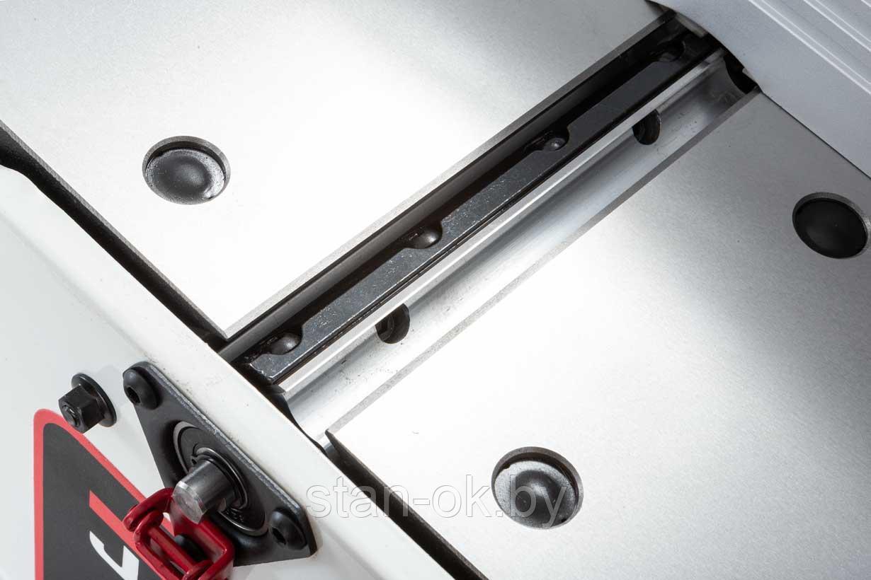 Как и у старших моделей, появилась возможность регулировки подающего и принимающего столов. И не только по высоте, но и по плоскости. А параллельный упор, изготовленный из экструдированного алюминия, имеет небольшой вылет и дополнительно может быть зафиксирован опционально поставляемыми кронштейнами для усиления жёсткости при фуговании тяжёлых длинных заготовок.